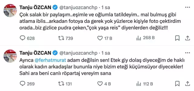 Sosyal medyada büyük yankı uyandıran fotoğraf karesine bir paylaşımı alıntılayarak yanıt veren Özcan, "Çok salak bir paylaşım. Eşimle ve oğlumla tatildeyim. Mal bulmuş gibi atlama iblis. Arkadan fotoya da gerek yok, yüzlerce kişiyle foto çektirdim orada" ifadelerini kullandı.