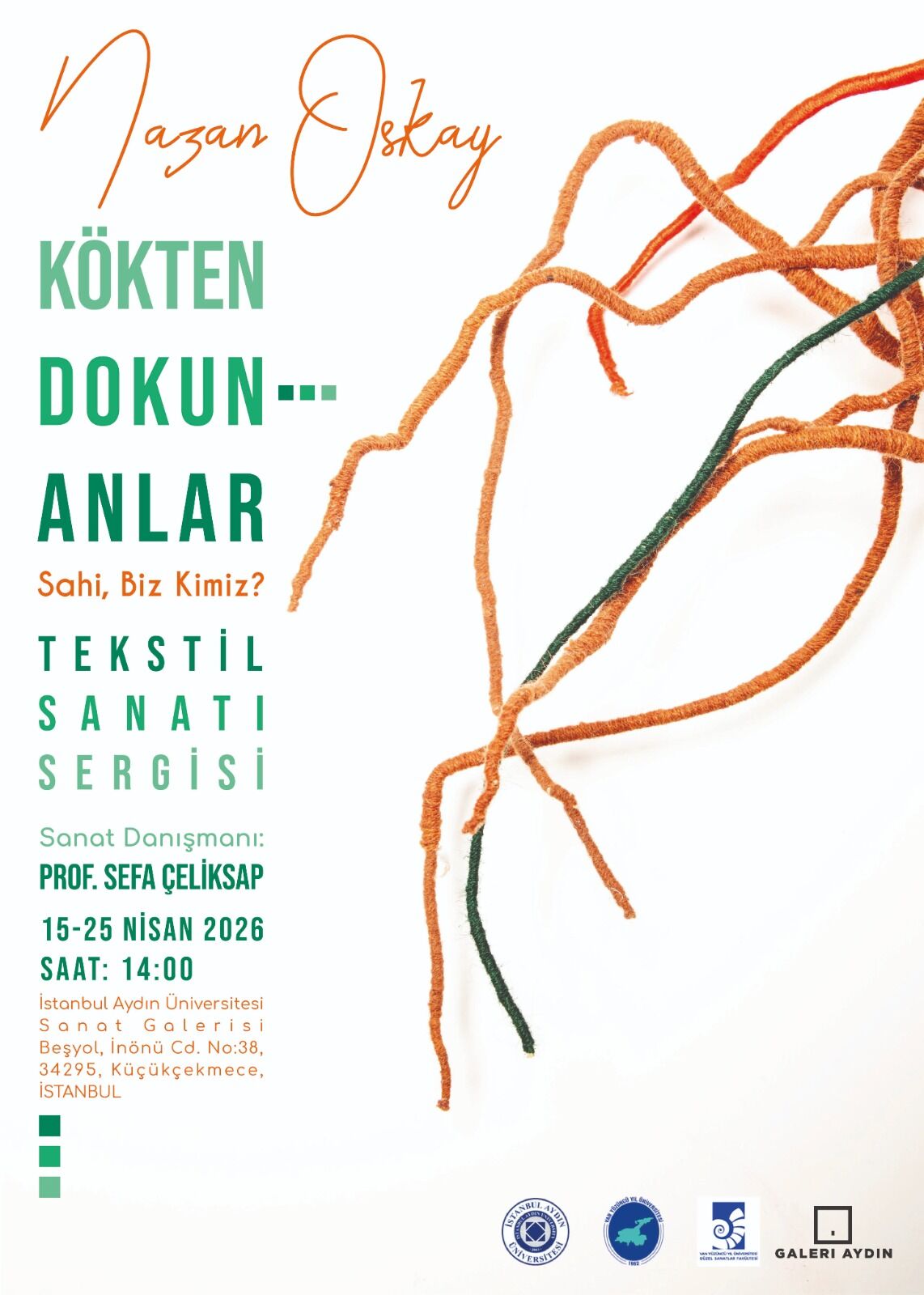 Van Yüzüncü Yıl Üniversitesi Güzel Sanatlar Fakültesi öğretim üyesi Doç. Dr. Nazan Oskay’ın “Kökten Dokun-anlar: Sahi, Biz Kimiz?” başlıklı kişisel tekstil sanatı sergisi, 15 Nisan 2026 tarihinde İstanbul Aydın Üniversitesi Sanat Galerisi’nde sanatseverlerle buluşuyor.