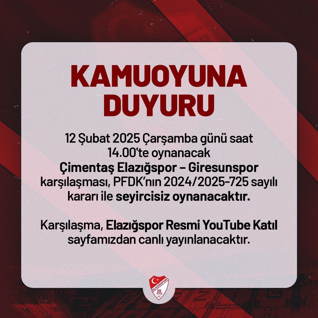 Nesine 2. Lig Kırmızı Grup’un 21. Haftası’nda Elazığ Atatürk Stadyumu’nda oynan Vanspor FK maçında çıkan olaylardan ötürü Profosyonel Futbol Disiplin Kurulu’na sevk edilen Elazığspor’un cezası belli oldu. Elazığspor’a çıkan olaylardan ötürü 1 maç seyircisiz oynama cezası aldı. Elazığspor Kulübü’nden konuya ilişkin yapılan açıklamada, "12 Şubat Çarşamba günü saat 14.00’te oynanacak olan Elazığspor-Giresunspor karşılaşması PFDK’nın 2024/2025-725 sayılı kararı ile seyircisiz oynanacaktır. Karşılaşma Elazığspor resmi YouTube Katıl sayfamızdan canlı yayınlanacaktır." denildi.
