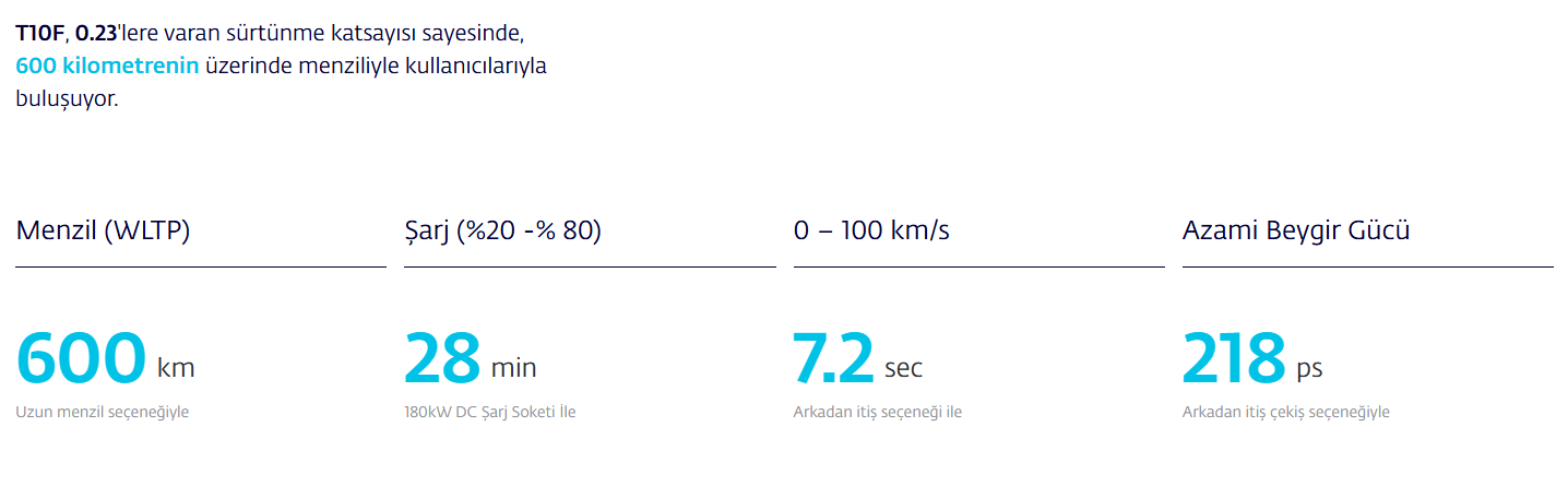 2024 Ağustos ayında mühendislik testleri başlayan modern fastback modeli T10F piyasadaki mevcut SUV modelden yaklaşık 80 kilometre daha fazla yani 600 kilometre menzile sahip olacak.