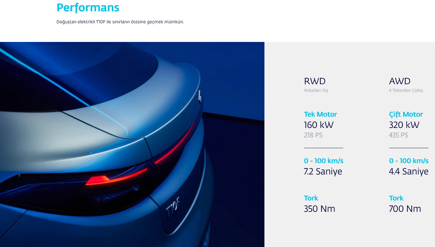 T10F, yalnızca 28 dakikada yüzde 20’den yüzde 80’e şarj olabiliyor. 0’dan 100 km/s hıza 7,2 saniyede ulaşan sedan, 218 beygir gücünde elektrikli motora sahip.