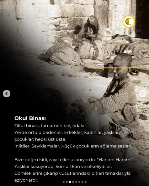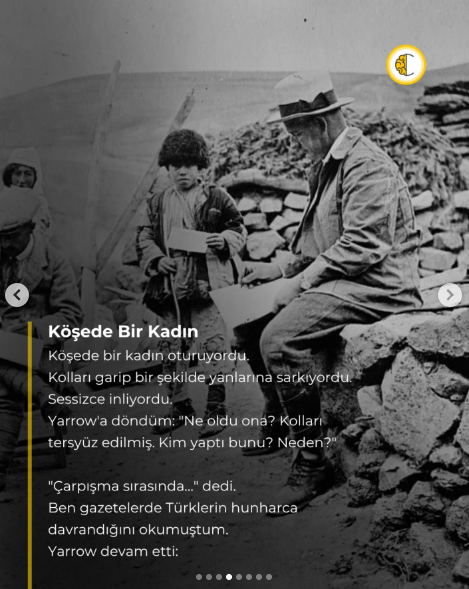 Köşede bir kadın oturuyordu. Kolları garip bir şekilde yanlarına sarkıyordu. Sessizce inliyordu. Yarrow’a döndüm. “Ne oldu ona? Kolları tersyüz edilmiş. Kim yaptı bunu? Neden?”, “Çarpışma sırasında…” dedi. Ben gazetelerde Türklerin hunharca davrandığını okumuştum. Yarrow devam etti: “Katliam her iki taraftan oldu. Burada biz Ermenilerin gaddarlığını gördük. Bu insanlık dışı gaddarlığın kurbanlarını bizzat gördüm.”