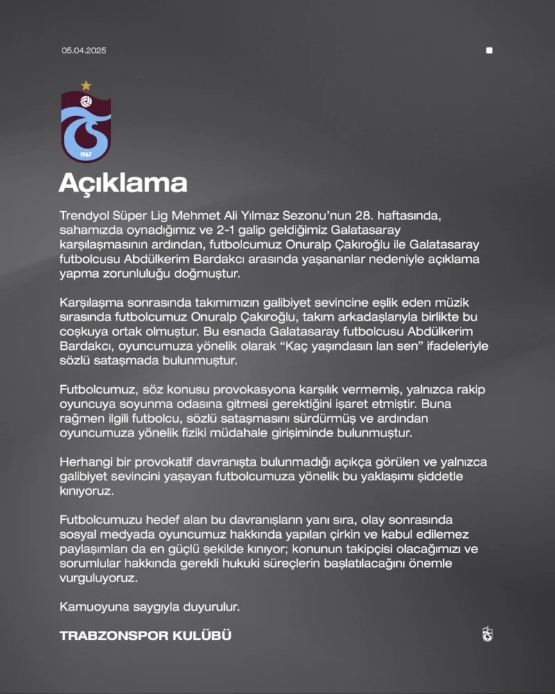 Karadeniz ekibinin açıklaması şu şekilde: “Süper Lig Mehmet Ali Yılmaz Sezonu’nun 28. haftasında, sahamızda oynadığımız ve 2-1 galip geldiğimiz Galatasaray karşılaşmasının ardından, futbolcumuz Onuralp Çakıroğlu ile Galatasaray futbolcusu Abdülkerim Bardakcı arasında yaşananlar nedeniyle açıklama yapma zorunluluğu doğmuştur.