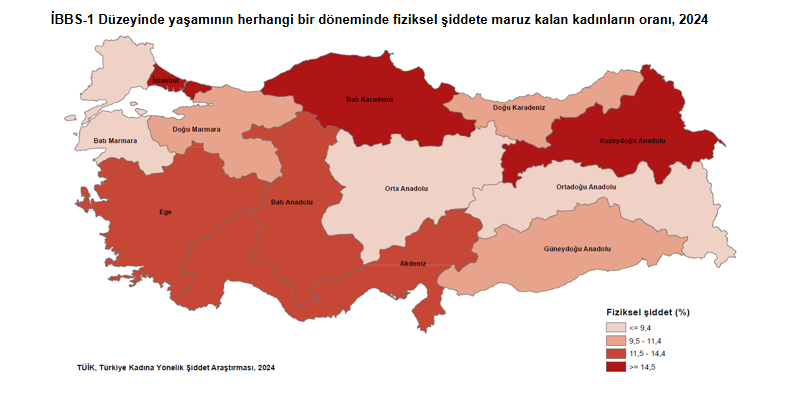 Araştırma sonuçlarına göre, İBBS-1 düzeyinde fiziksel şiddetin en yüksek olduğu bölge yüzde 25,9 ile Kuzeydoğu Anadolu olurken, en düşük bölge yüzde 8,8 ile Ortadoğu Anadolu olarak kaydedildi. Van da şiddetin en düşük olduğu Ortadoğu Anadolu Bölgesi’nde yer aldı. Araştırmanın amacı, Türkiye’de kadına yönelik şiddetin mevcut durumunu, risk faktörlerini, etkilerini, mücadele yöntemlerini ve toplumsal farkındalığı ortaya koymak olarak açıklandı.