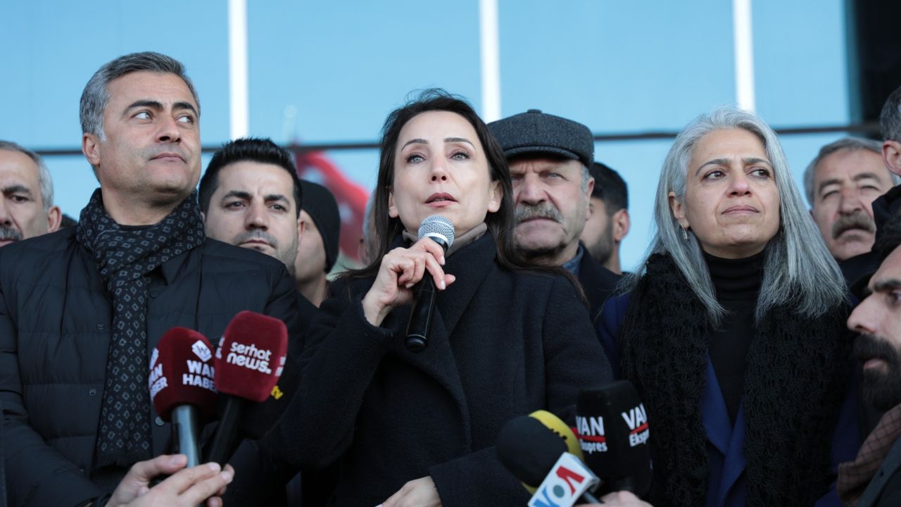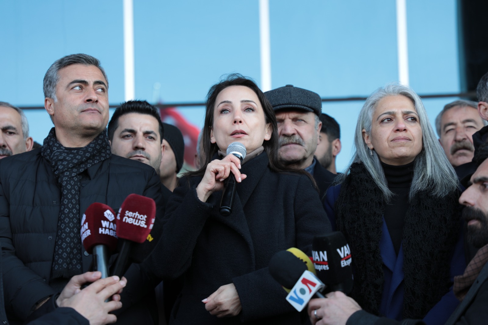 Van Büyükşehir Belediyesi Eşbaşkanı Abdullah Zeydan’a 3 yıl 9 ay hapis cezası verilmesinin ardından belediye binası önünde başlatılan nöbet devam ediyor. DEM Parti Eş Genel Başkanı Tülay Hatimoğulları, DBP Eş Genel Başkanı Çiğdem Kılıçgün Uçar, bölge milletvekilleri ve seçilmişler, Van Büyükşehir Belediyesi önündeki eyleme katıldı. Burada konuşan DEM Parti Eş Genel Başkanı Tülay Hatimoğulları, “Türkiye’nin yüreği Van için atıyor” dedi.