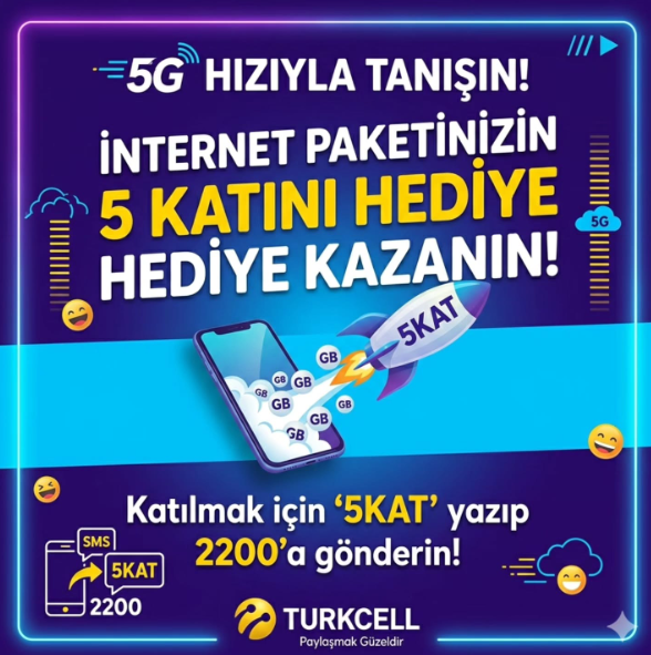 Kampanya kapsamında abonelerin, “5KAT” yazıp 2200’a SMS göndermesi yeterli oluyor. Bu işlemin ardından kullanıcıların kullanmakta olduğu mevcut internet paketlerinin 5 katı kadar ek kullanım hakkı tanımlanıyor. Söz konusu uygulama, 5G sürecine yönelik farkındalığı artırmayı ve kullanıcı deneyimini desteklemeyi hedefleyen adımlar arasında yer alıyor.