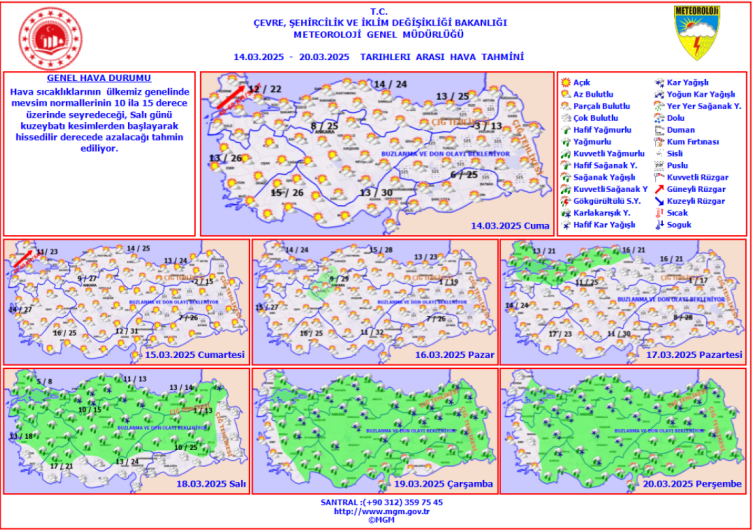 Macit, son değerlendirmelere göre; Hafta sonu ülke genelinde yağış beklentisinin olmadığını altını çizerken hafta sonunda hava sıcaklıklarının şu anda mevsim normallerinin üzerinde olduğunu belirtti. Macit, "Sıcaklıklar salı gününe kadar böyle devam ediyor. Hava sıcaklıklarının yurt genelinde salı gününden itibaren kuzeybatı kesimlerden başlayarak hissedilir derecede azalmasını bekliyoruz. Çarşamba ve perşembe günü yurt genelinde mevsim normallerinin altına düşecek ama pazartesiye kadar mevsim normallerinin 10-15 derece üzerinde seyredecek." diye konuştu.