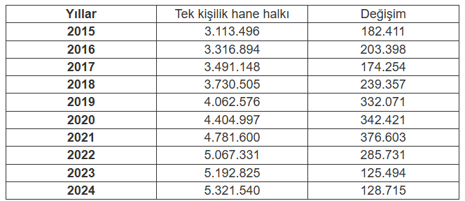 TÜİK verilerine göre, tek kişilik hane halkı sayısı ve değişimi (2015-2024) şöyle: