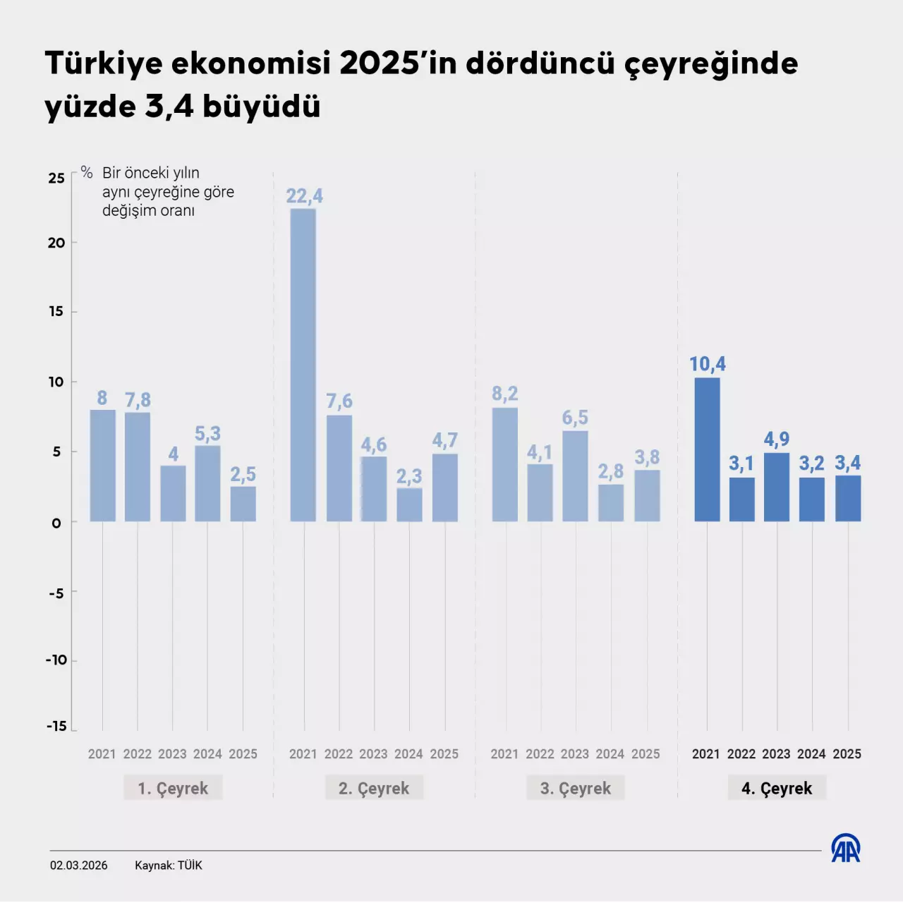 Son dakika haberi... Türkiye ekonomisi, geçen yıl yüzde 3,6 büyüme gösterdi. Türkiye İstatistik Kurumu (TÜİK), 2025'e ilişkin Gayri Safi Yurt İçi Hasıla (GSYH) sonuçlarını açıkladı. Buna göre, Türkiye ekonomisi, geçen yıl yüzde 3,6, 2025'in son çeyreğinde de yüzde 3,4 büyüme kaydetti. Böylece Türkiye ekonomisi, büyüme trendini 22 çeyreğe taşımış oldu.