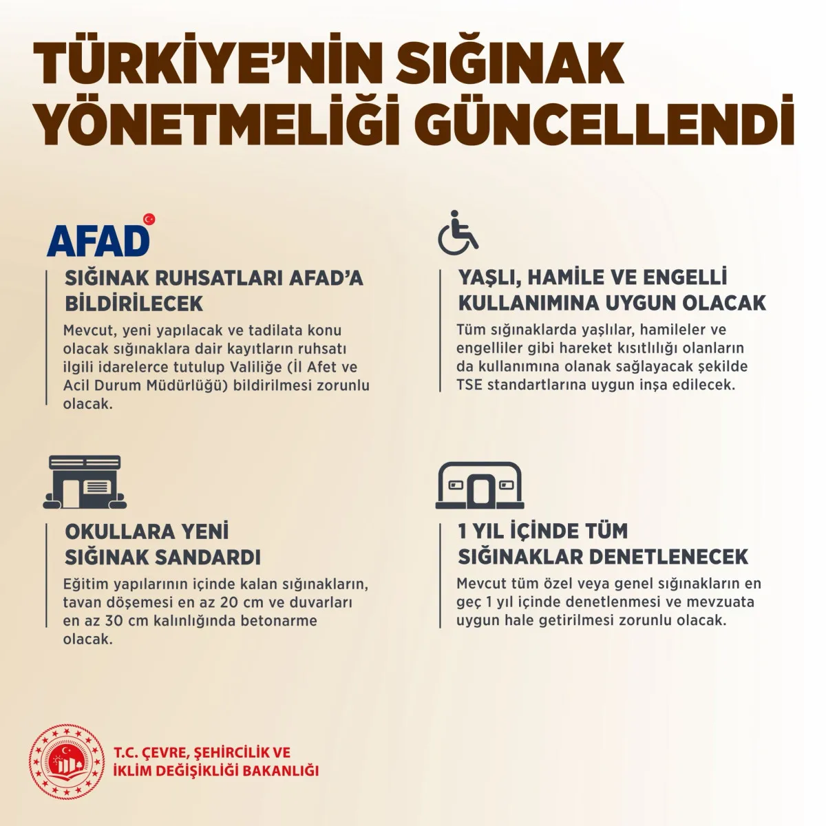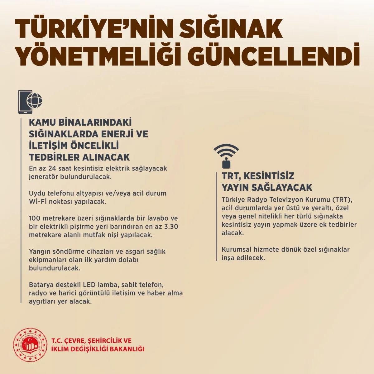 Türkiye’nin sığınak yönetmeliği, nüfus artışı ve şehirleşme gibi çağın şartları göz önünde bulundurularak Çevre, Şehircilik ve İklim Değişikliği Bakanlığı Mesleki Hizmetler Genel Müdürlüğü koordinasyonunda güncellendi. 44 farklı kurum ve kuruluş ile iş birliği içinde yürütülen çalışmalar 6 ayda tamamlandı. Yönetmelik değişikliği ile ilgili sosyal medya hesabından paylaşım yapan Çevre, Şehircilik ve İklim Değişikliği Bakanı Murat Kurum, “Ülkemizin sığınak yönetmeliğini günümüz ihtiyaç ve koşullarına uygun hale getirerek güncelledik. Mevcut sığınaklara denetim şartı ve ilave standartlar, yeni yapılacak binalara önemli koşullar getirdik. Resmi Gazete’de yayımlanan yönetmeliğimizle; millet bahçeleri, metro tünelleri gibi alanları sığınak hizmeti verecek şekilde düzenleyeceğiz. Milletimizin huzur ve güveni için gereken her adımı atmaya devam edeceğiz" ifadelerini kullandı.