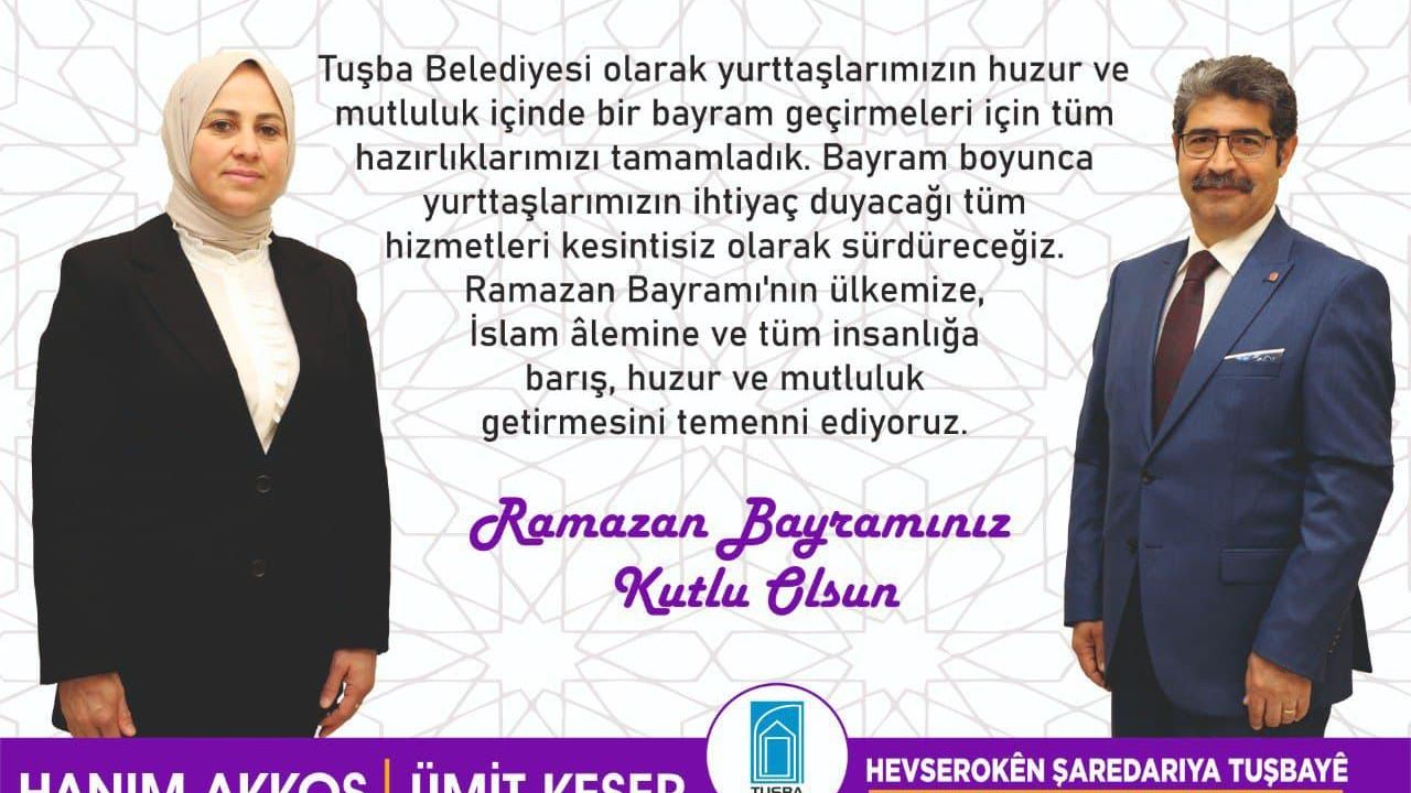 Tuşba Belediye Eşbaşkanları bayram mesajında; “Tuşba Belediyesi olarak yurttaşlarımızın huzur ve mutluluk içinde bir bayram geçirmeleri için tüm hazırlıklarımızı tamamladık. Bayram boyunca yurttaşlarımızın ihtiyaç duyacağı tüm hizmetleri kesintisiz olarak sürdüreceğiz. Ramazan Bayramı'nın ülkemize, İslam âlemine ve tüm insanlığa barış, huzur ve mutluluk getirmesini temenni ediyoruz” dedi.