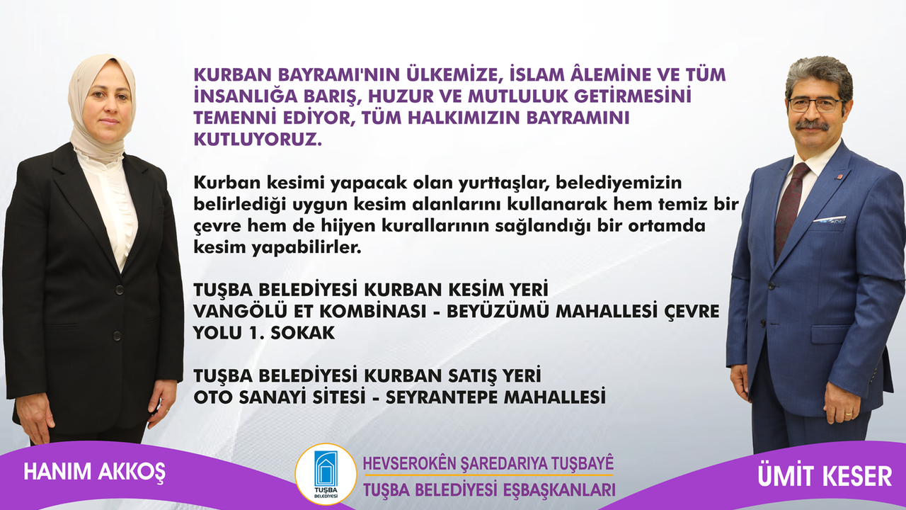 Tuşba Belediyesi Eşbaşkanları Hanım Akkoş ve Ümit Keser yayınladığı Kurban Bayramı mesajında; "Kurban Bayramı’nın ülkemize, İslam âlemine ve tüm insanlığa barış, huzur ve mutluluk getirmesini temenni ediyor, tüm halkımızın bayramını kutluyoruz. Kurban kesimi yapacak olan yurttaşlar, belediyemizin belirlediği uygun kesim alanlarını kullanarak hem temiz bir çevre hem de hijyen kurallarının sağlandığı bir ortamda kesim yapabilirler" ifadelerine yer verildi.