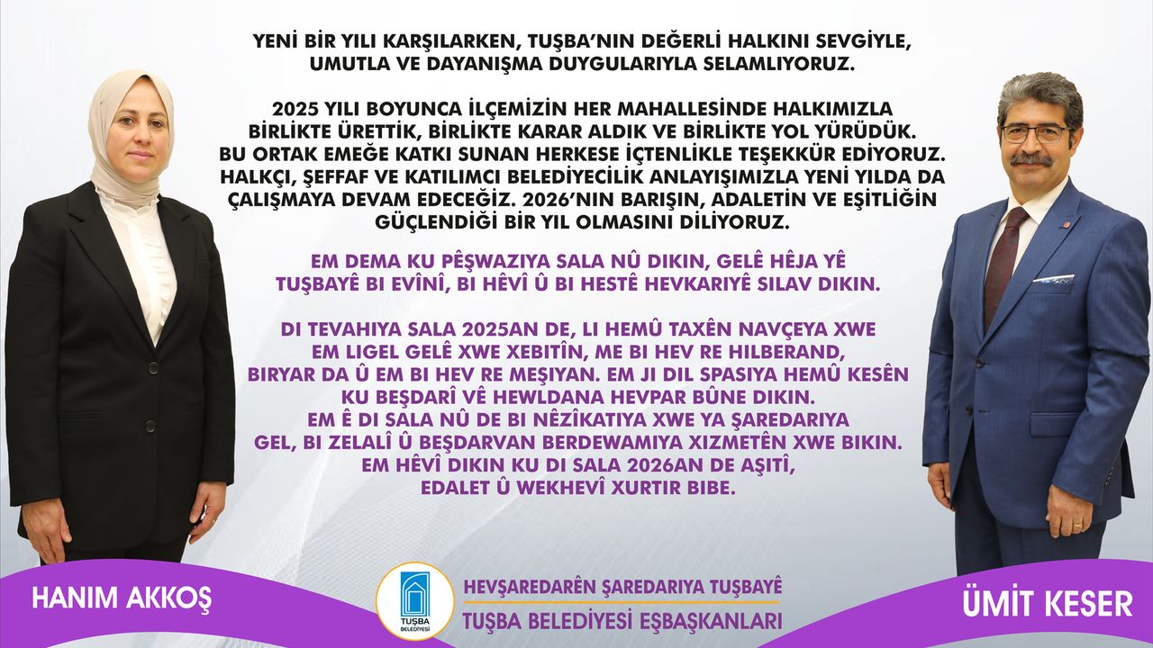 Tuşba Belediyesi Eşbaşkanları Hanım Akkoş ve Ümit Keser yeni yıl münasebetiyle bir mesaj yayımlayarak başta Tuşba halkı olmak üzere tüm Vanlıların yeni yılını kutladı.