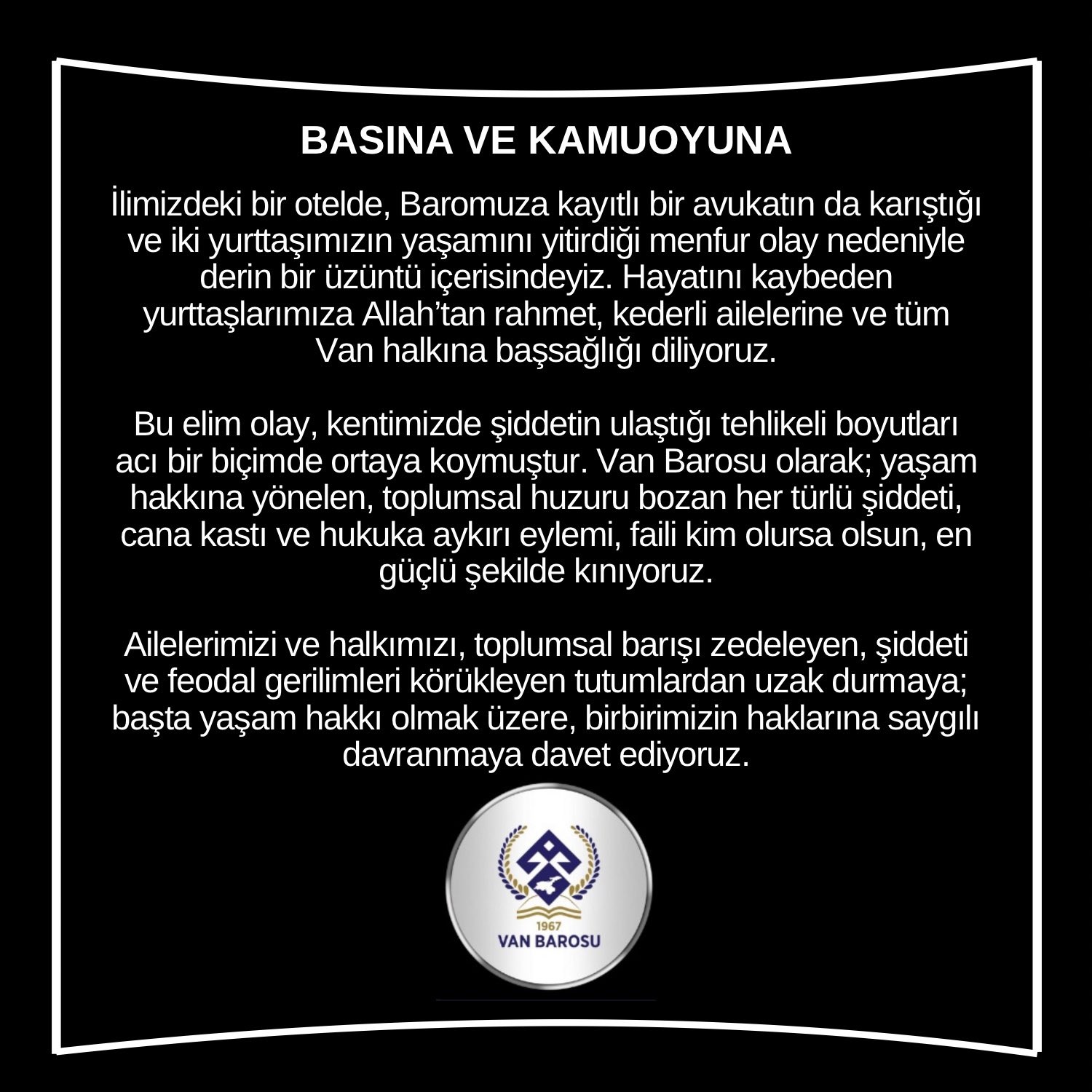Baro tarafından yapılan açıklamada, “İlimizdeki bir otelde, Baromuza kayıtlı bir avukatın da karıştığı ve iki yurttaşımızın yaşamını yitirdiği menfur olay nedeniyle derin bir üzüntü içerisindeyiz. Hayatını kaybeden yurttaşlarımıza Allah'tan rahmet, kederli ailelerine ve tüm Van halkına başsağlığı diliyoruz” denildi.