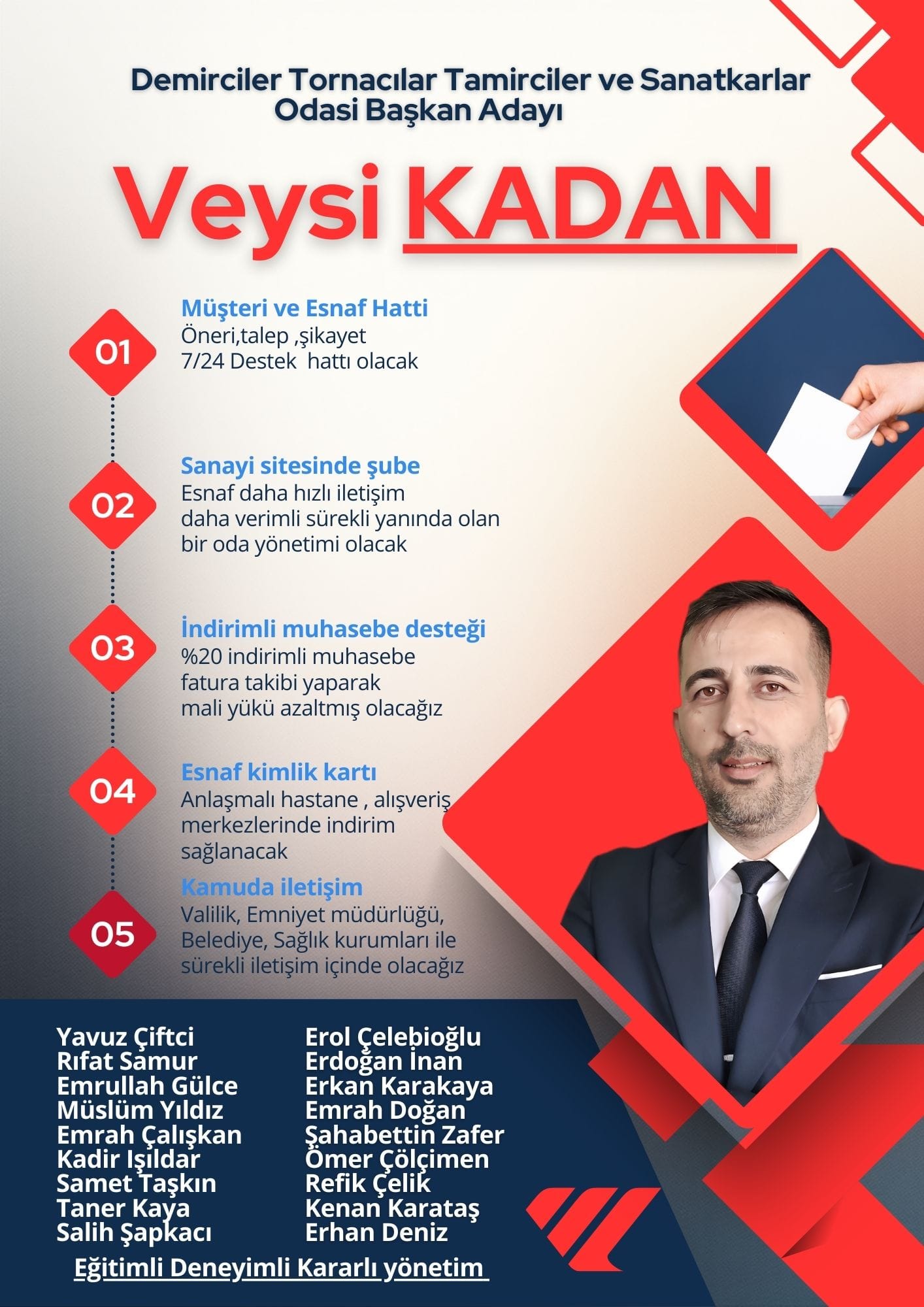 Başkan Adayı Veysi Kadan, esnafın ihtiyaçlarına yönelik çeşitli projelerle seçimde iddialı. Kadan’ın vaatleri arasında: