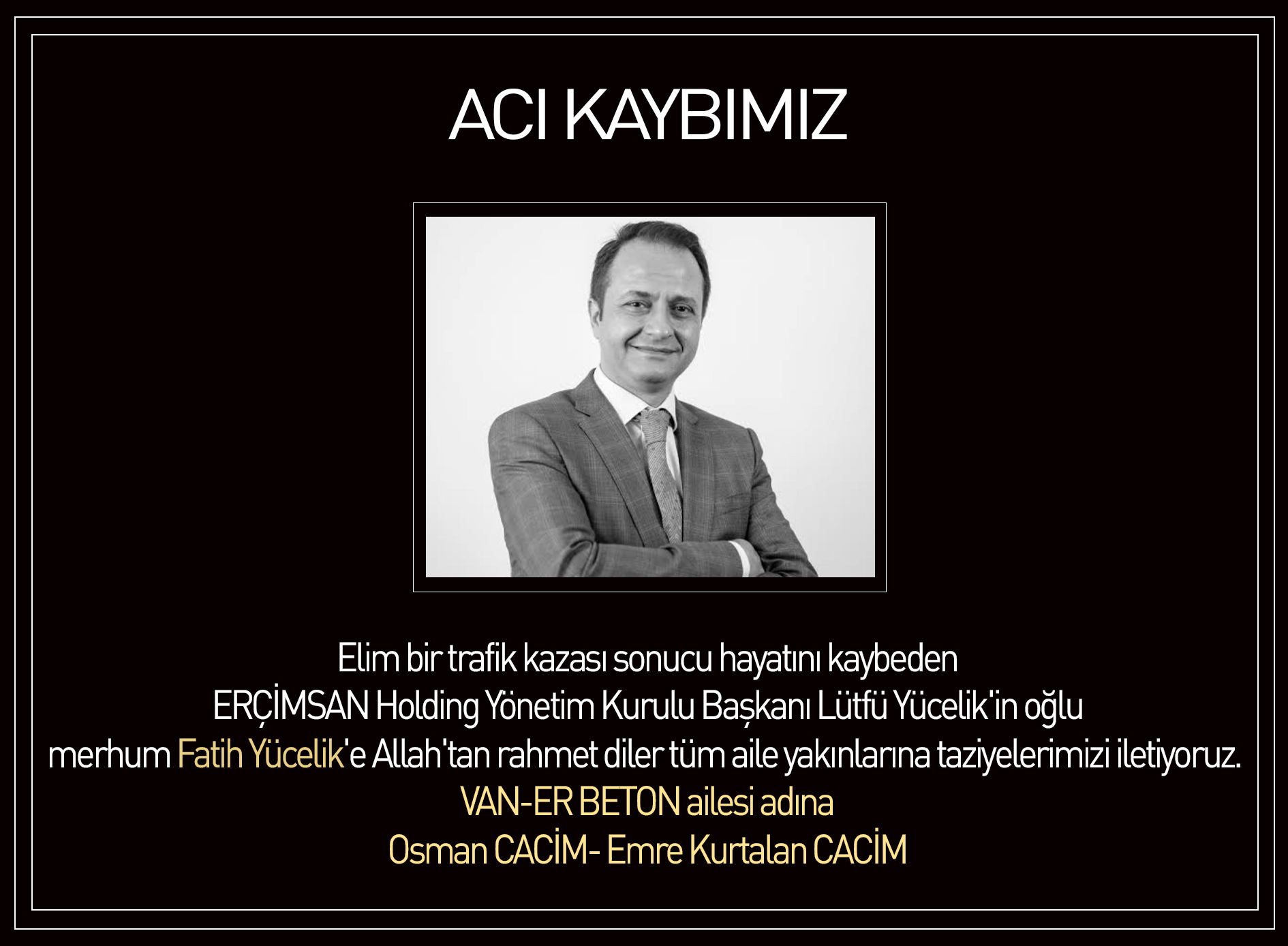 ERÇİMSAN Holding Yönetim Kurulu Başkanı Lütfü Yücelik'in oğlu merhum Fatih Yücelik trafik kazası sonucu hayatını kaybetti. VAN-ER BETON ailesi adına Osman Cacim- Emre Kurtalan Cacim, ERÇİMSAN Holding Yönetim Kurulu Başkanı Lütfü Yücelik'in oğlu merhum Fatih Yücelik’in ailesi ve sevenlerine taziyelerini ileterek bir mesaj yayınladı.