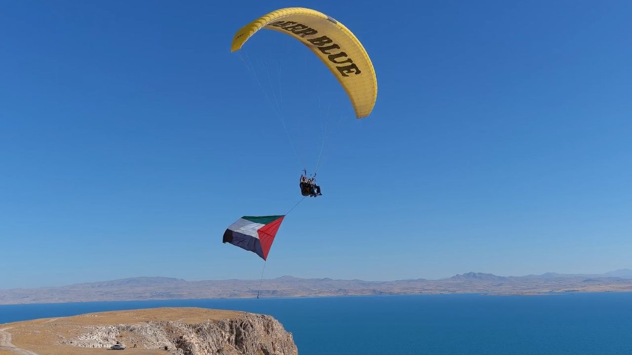 İsrail'in Filistin halkına yönelik başlattığı saldırılar devam ediyor. Filistin halkına yapılan zulme karşı en büyük desteği veren ülkelerin başında gelen Türkiye'de halk her fırsatta tepkisini göstermeyi sürdürüyor. Bütün önemli etkinliklerde yamaç paraşütü ve paramotor ile yaptığı uçuşlarla etkinliklere destek veren Antalyalı Yamaç Paraşütü Pilotu Mehmet Sadık Göller, takım arkadaşıyla birlikte havalanarak Van Gölü semalarında Filistin bayrağı açtı. Zulmün 2'nci yıl dönümünde Filistin halkına ve Sumud Filosu'na destek vermek için havalandığını belirten Göller, bu zulmün bir an önce bitmesini ve Filistin halkının özgürlüğüne kavuşmasını istedi. Göller,