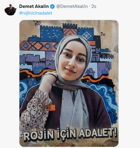 Akalın, sosyal medya platformu X hesabından yaptığı paylaşımda, “#RojinİçinAdalet” etiketiyle Rojin Kabaiş’e adalet çağrısında bulundu.