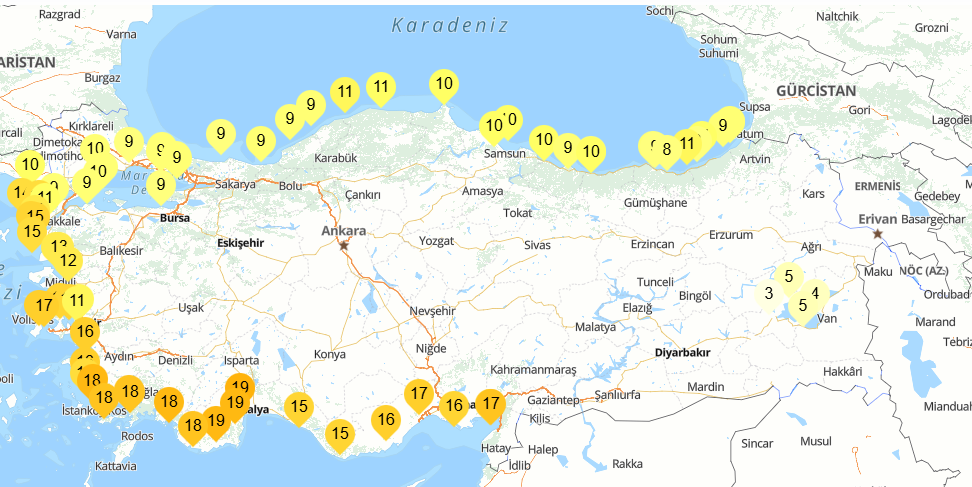 Yapılan ölçümlere göre, Van Gölü’nün farklı noktalarındaki yüzey suyu sıcaklıkları şu şekilde: