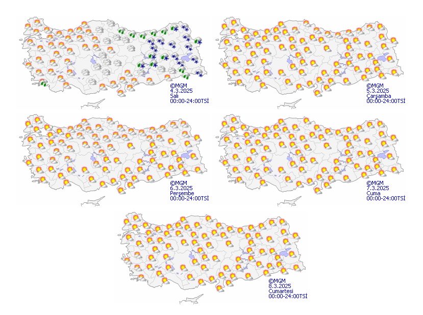 Meteorolojiden yapılan son hava tahminlere göre: Yurt genelinin parçalı, yer yer çok bulutlu, Muğla, Antalya'nın batı kesimleri, Rize, Artvin'in kıyı kesimi, Doğu Anadolu'nun kuzeyi ile Van'ın doğu kesimlerinin yağışlı geçeceği tahmin ediliyor. Yağışların, Artvin'in iç kesimleri ile Doğu Anadolu'nun kuzeyinde karla karışık yağmur ve kar, diğer yerlerde yağmur ve sağanak şeklinde olması bekleniyor. Yurdun güneydoğu kesimlerinde toz taşınımı, doğu kesimlerinde buzlanma ve don olayı, kuzey ve iç kesimlerinde pus ve yer yer sis hadisesi bekleniyor. Doğu Karadeniz’in iç kesimlerinin yüksekleri ile Doğu Anadolu’nun yüksek ve dik yamaçlarında çığ tehlikesi bulunmaktadır. Hava sıcaklığının hava sıcaklıklarının yurt genelinde artarak mevsim normallerinin 4-8 derece üzerinde seyretmesi bekleniyor. Rüzgarın genellikle kuzeyli, yurdun güneydoğu kesimlerinde güney ve doğu yönlerden hafif, ara sıra orta kuvvette, Marmara’nın güneybatısı ve Ege kıyılarında kuvvetli (30-60 km/sa) esmesi bekleniyor.