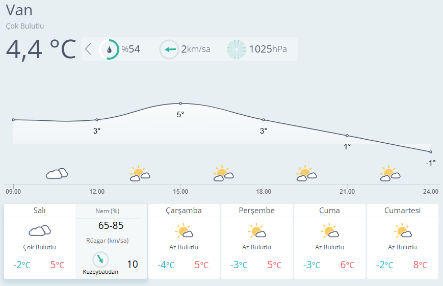 Parçalı ve çok bulutlu, sabah saatlerinde bölgenin kuzeyinin hafif olmak üzere karla karışık yağmur ve kar yağışlı, öğle saatlerinde Van'ın doğu kesimlerinin yağmurlu geçeceği tahmin ediliyor. Bölge genelinde buzlanma ve don olayı ile birlikte pus, yer yer sis hadisesi bekleniyor. Bölgenin yüksek, dik ve eğimli yamaçlarında çığ tehlikesi bulunmaktadır.