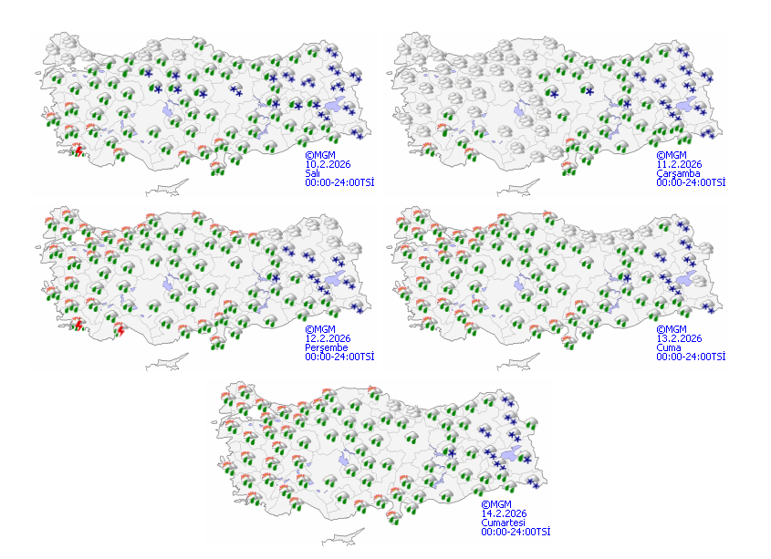 Bölge genelinde havanın çok bulutlu, aralıklı karla karışık yağmur ve kar yağışlı olması beklenmektedir. Gece saatlerinden itibaren Van’ın kuzey ilçelerinde (Erciş, Çaldıran ve Muradiye) aralıklı kar yağışı beklenmektedir. Sabah saatlerinden itibaren Bitlis çevreleri ile Muş’un yüksek kesimleri ile Hakkari çevrelerinde aralıklı kuvvetli kar yağışı (10–20 cm üzeri), bölgenin düşük rakımlı kesimlerinde ise aralıklı kuvvetli karla karışık yağmur beklenmektedir.