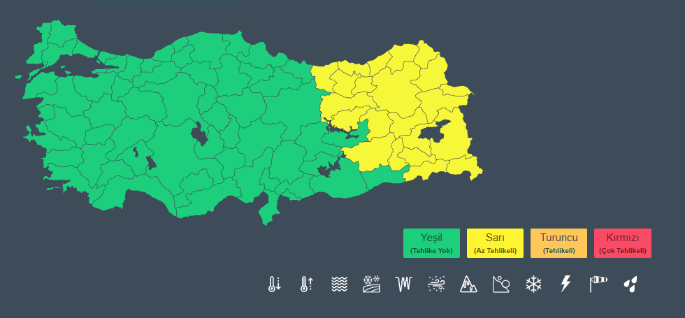 Ülkemizin kuzey, iç ve doğu kesimlerinde buzlanma ve don olayı beklendiğinden yaşanabilecek olumsuzluklara karşı dikkatli ve tedbirli olunması gerekmektedir. Doğu Karadeniz’in iç kesimlerinin yüksekleri ile Doğu Anadolu’nun doğusunda yüksek kar örtüsüne sahip eğimli kesimlerinde çığ tehlikesi bulunmaktadır.