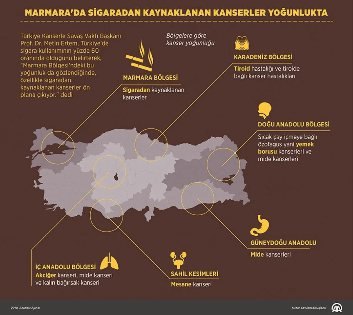 Türkiye Kanserle Savaş Vakfı Başkanı Prof. Dr. Ertem, Türkiye'de sigara kullanımının yüzde 60 oranında olduğunu belirterek, "Marmara Bölgesi'ndeki bu yoğunluk da gözlendiğinde, özellikle sigaradan kaynaklanan kanserler ön plana çıkıyor." dedi. Prof. Dr. Metin Ertem, Türkiye'nin kanser haritasına ilişkin yaptığı açıklamada, bölgelerin yoğunluklarına ve insan kalabalıklarına göre kanser türlerinin değişiklik gösterdiğini söyledi.