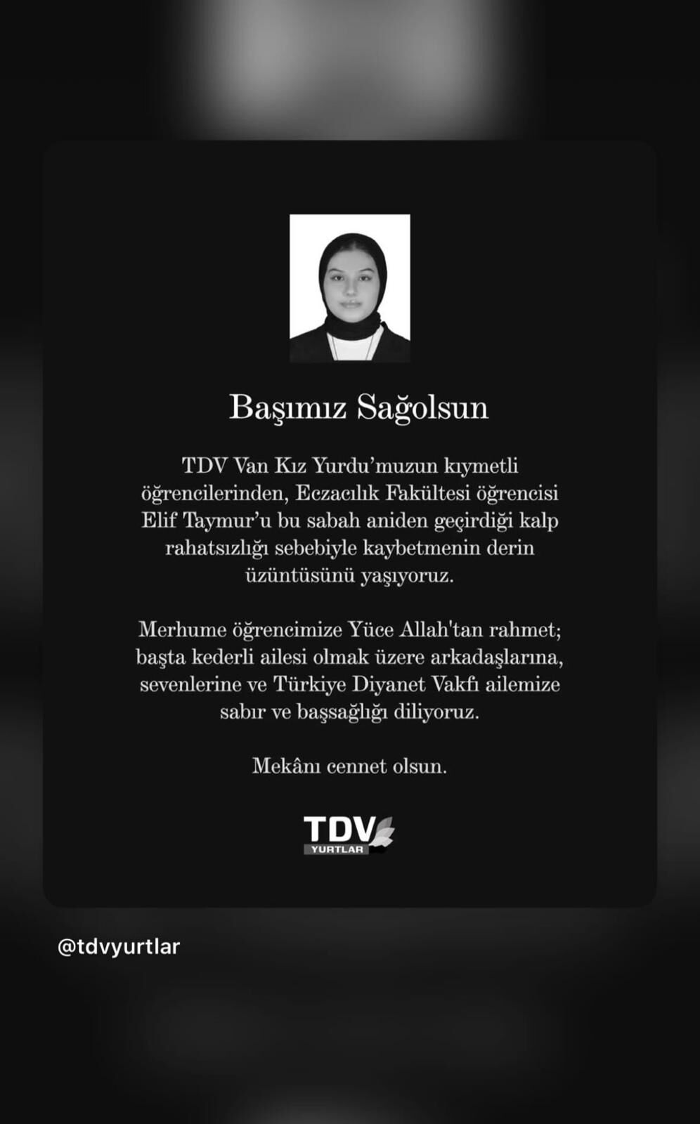 Türkiye Diyanet Vakfı’nın sosyal medya hesaplarından yapılan açıklamada, genç öğrencinin vefatından duyulan derin üzüntü dile getirildi. Açıklamada, “Yurdumuzun kıymetli öğrencilerinden, Eczacılık Fakültesi öğrencisi Elif Taymur’u bu sabah aniden geçirdiği kalp rahatsızlığı sebebiyle kaybetmenin derin üzüntüsünü yaşıyoruz. Merhume öğrencimize Yüce Allah’tan rahmet; başta kederli ailesi olmak üzere arkadaşlarına, sevenlerine ve Türkiye Diyanet Vakfı ailemize sabır ve başsağlığı diliyoruz.” ifadelerine yer verildi.