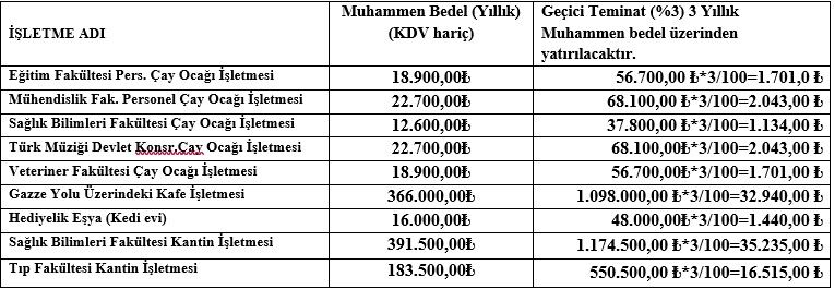 1) Üniversitemiz Yerleşkesi içinde bulunan 9 Adet İşletmenin 2886 Sayılı Devlet İhale Kanunun 36. maddesi uyarınca, 3 (Üç) yıl üzerinden Kapalı Teklif Usulü ile kiraya verilecektir.