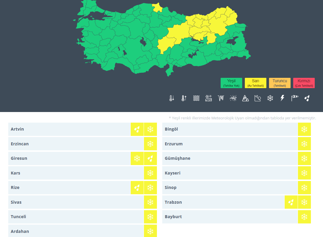 Meteoroloji'nin sarı kod uyarısı verdiği iller sırasıyla; Artvin, Bingöl, Erzincan, Erzurum, Giresun, Gümüşhane, Kars, Kayseri, Rize, Sinop, Sivas, Trabzon, Tunceli, Bayburt, Ardahan oldu.