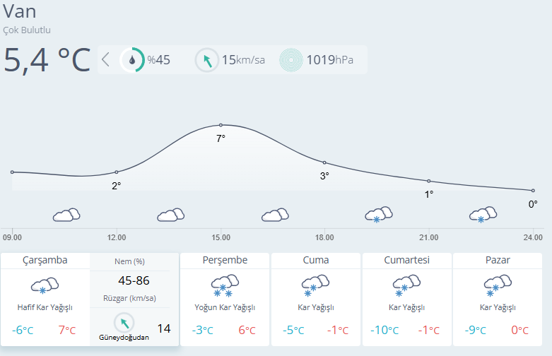 Meteoroloji Van’ın yeni hava durumunu açıkladı. Yapılan son meteorolojik değerlendirmelere göre; son yılların en kurak kışını geçiren Van için meteoroloji beklenen kar yağışı için müjde verdi. Van’da aylardır yağması beklenen kar yağışının bugün itibarıyla kente giriş yapması beklenirken Bahçesaray, Başkale, Çaldıran, Çatak Erciş, Gevaş, Gürpınar, Muradiye’de karla karışık yağmur ve kar yağışı bekleniyor. Yeni haftaya kadar etkisini sürdürmesi beklenen kar yağışının yarın itibarıyla tüm kentte etkili olması bekleniyor.