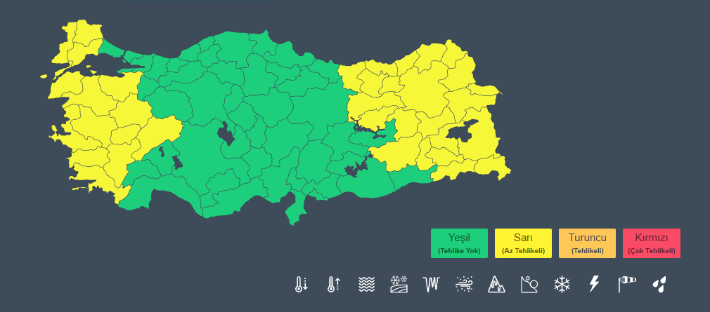Afyonkarahisar, Ağrı, Ardahan, Artvin, Aydın, Balıkesir, Batman, Bayburt, Bingöl, Bitlis, Bursa, Çanakkale, Denizli, Diyarbakır, Edirne, Erzincan, Erzurum, Giresun, Gümüşhane, Hakkari, Iğdır, İzmir, Kars, Kırklareli, Kütahya, Manisa, Muğla, Muş, Rize, Siirt, Şırnak, Tekirdağ, Trabzon, Tunceli, Uşak ve Van dahil olmak üzere 36 ile sarı kod uyarısı yapıldı.