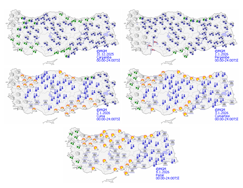 Meteoroloji Genel Müdürlüğü tarafından yapılan tahminlere göre: Ülke genelinde havanın parçalı ve çok bulutlu olması beklenirken Marmara'nın güney ve doğusu, Ege, Akdeniz, İç Anadolu, Batı Karadeniz ile Tekirdağ, Çorum, Tokat, Gaziantep, Adıyaman ve Kilis çevrelerinin yağışlı geçeceği tahmin ediliyor. Yağışların; Marmara'nın batısı, Kıyı Ege ve Akdeniz kıyılarında yağmur ve sağanak, Güney Ege kıyılarında gök gürültülü sağanak, iç ve yükseklerde karla karışık yağmur ve kar şeklinde olması bekleniyor. Yağışların Güney Ege kıyıları ile Antalya'nın doğusu, Mersin'in batısında kuvvetli olacağı tahmin ediliyor. Kuzey, iç ve doğu kesimlerde buzlanma ve don ile birlikte pus, yer yer sis görüleceği tahmin ediliyor. Hava sıcaklığının, güneyli rüzgârlarla birlikte batı ve iç kesimlerde biraz artacağı diğer yerlerde önemli bir değişiklik olmayacağı, ülke genelinde mevsim normallerinin altında seyretmesi bekleniyor.
