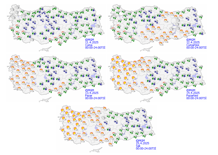 Meteorolojiden yapılan son hava tahminlerine göre: Ülke genelinde parçalı ve çok bulutlu olması beklenirken Marmara, Doğu Akdeniz (Mersin hariç), İç Anadolu'nun doğusu, Batı Karadeniz, Orta Karadeniz kıyıları, Doğu Karadeniz, Doğu ve Güneydoğu Anadolu ile İzmir, Manisa, Kütahya, Eskişehir, Ankara, ve Tokat çevrelerinin aralıklı yağışlı geçeceği tahmin ediliyor. Yağışların yağmur ve sağanak, Güney kesimlerde yer yer gök gürültülü sağanak, Batı Karadeniz'in iç kesimleri, İç Anadolu'nun doğusu, Doğu Anadolu'nun kuzeydoğusu ile Bilecik, Kütahya, Eskişehir ve Ankara çevrelerinde karla karışık yağmur ve kar şeklinde görülmesi beklenen yağışların gece saatlerinden sonra Batı Karadeniz ile Sakarya çevrelerinde yerel kuvvetli olması bekleniyor. Rüzgarın, Doğu Anadolu'nun doğusu, Güneydoğu Anadolu ile Elazığ ve Hatay çevrelerinde kuvvetli rüzgar ve fırtına (50-80 km/saat, yükseklerinde 90 km/saat) şeklinde eseceği tahmin ediliyor. Doğu Anadolu'nun güneydoğusu ve Güneydoğu Anadolu bölgesinde toz taşınımı bekleniyor.