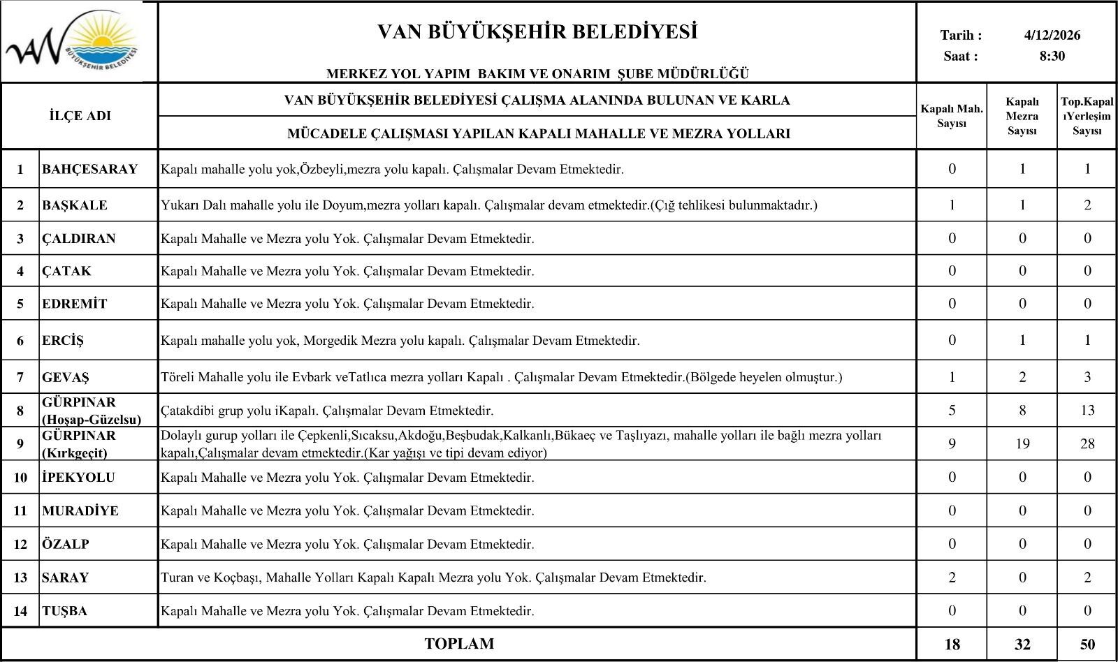 Belediyeden yapılan açıklamaya göre, 12 Nisan 2026 tarihi itibarıyla Van genelinde 18 mahalle yolu ve 32 mezra yolu olmak üzere toplam 50 yerleşim yerinin yolu ulaşıma kapandı. Özellikle kırsal ve yüksek rakımlı ilçelerde kar kalınlığının artmasıyla birlikte kapanan yol sayısının yükseldiği belirtildi.