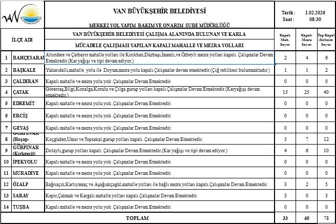 Belediyeden yapılan açıklamaya göre, 01 Şubat 2026 tarihi itibarıyla Van genelinde 33 mahalle yolu ve 45 mezra yolu olmak üzere toplam 78 yerleşim yerinin yolu ulaşıma kapalı bulunuyor. Özellikle kırsal ve yüksek rakımlı ilçelerde kar kalınlığının artmasıyla birlikte kapanan yol sayısının yükseldiği belirtildi.