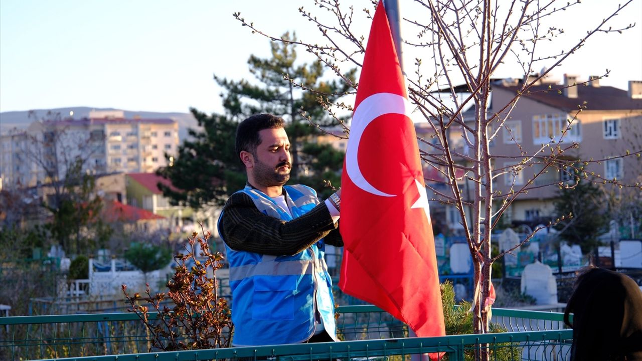 Eskiyen bayrakları yenileriyle değiştiren gençler, mezarlardaki yabani ot ve kuruyan ağaç dallarını temizledi.