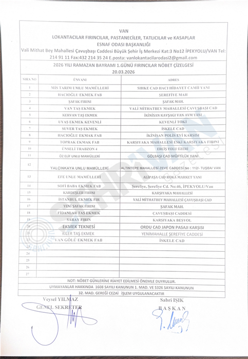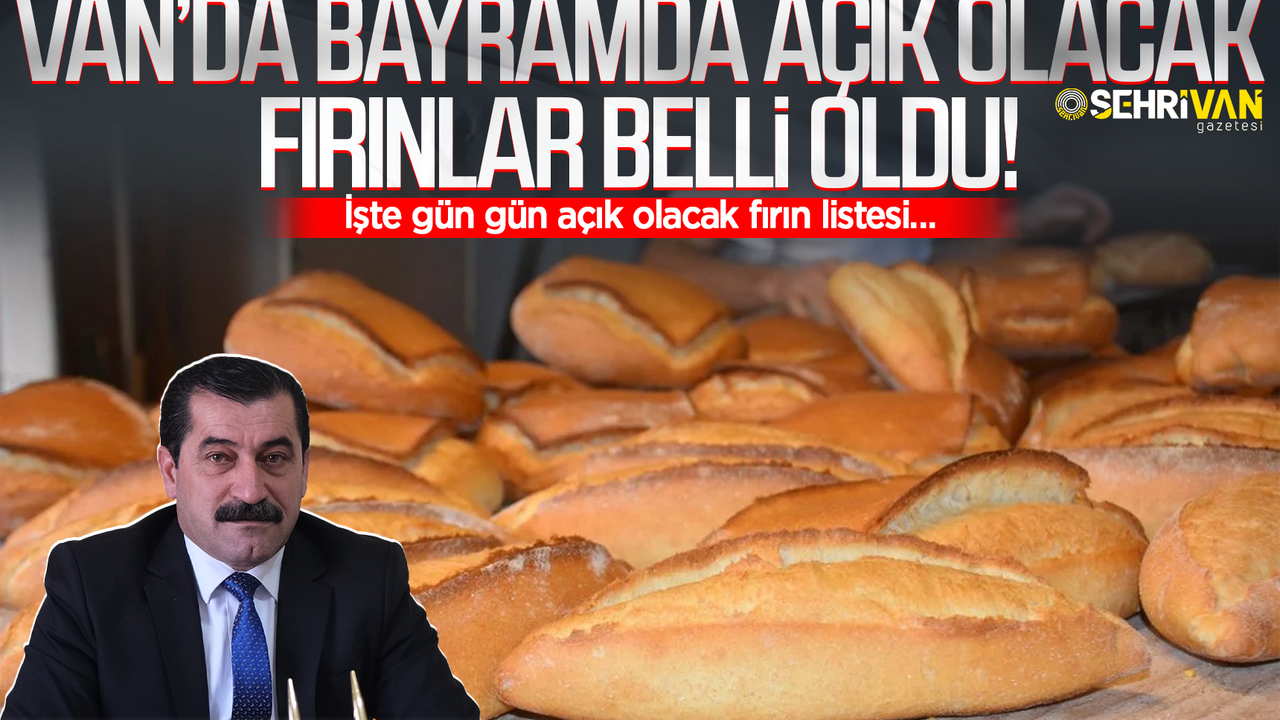 Van Fırıncılar Odası Başkanlığı Van’da bayram süresi boyunca açık olacak fırınların listesini açıkladı.