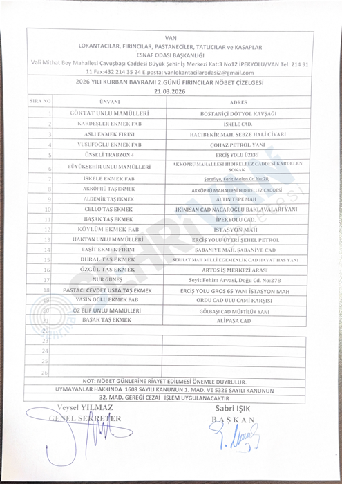 İşte Van’da bayramda gün gün açık olacak fırınların listesi;