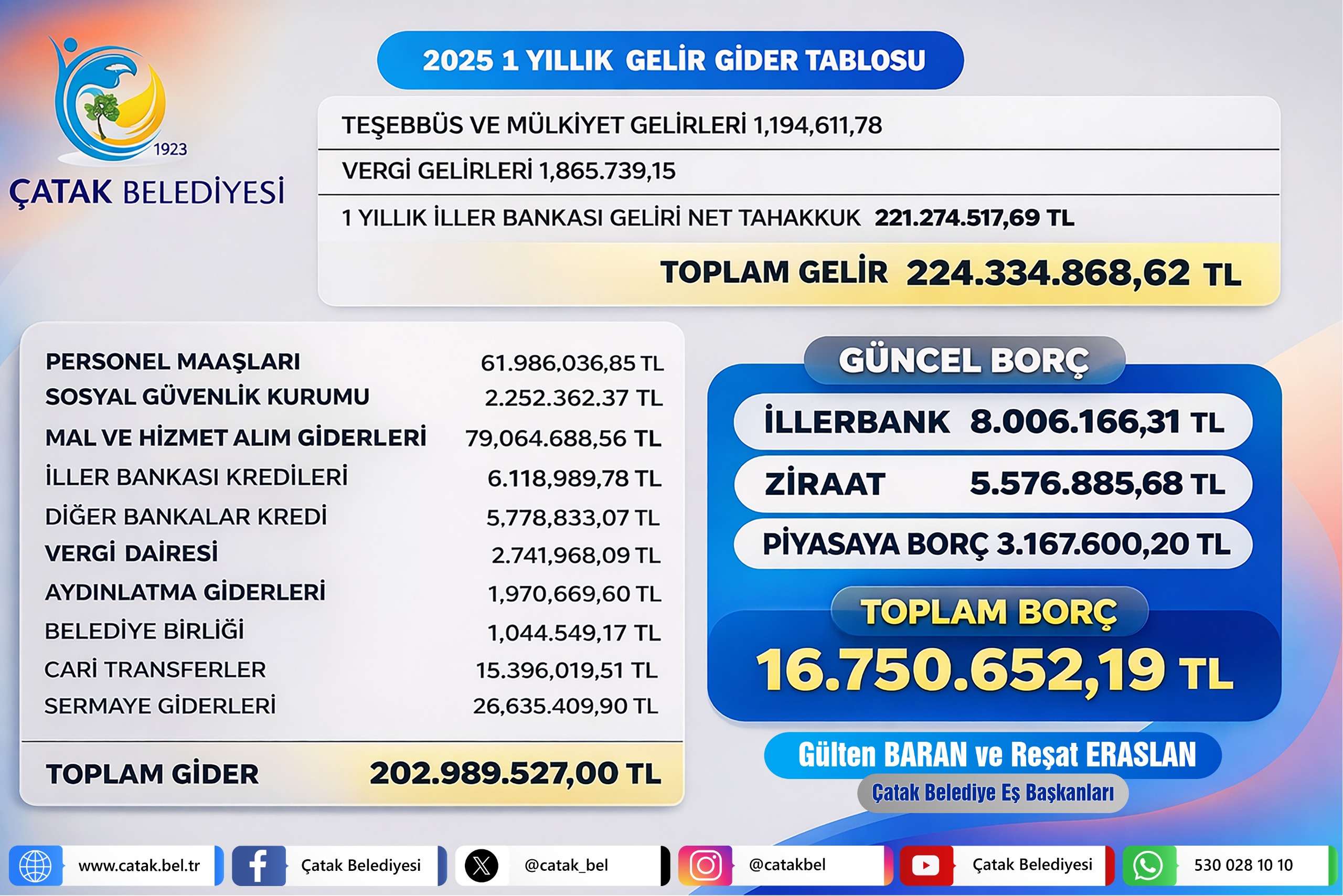 Çatak Belediyesi, 2025 yılına ait 1 yıllık gelir-gider tablosunu kamuoyuyla paylaştı. Açıklanan verilere göre belediyenin toplam geliri 224 milyon 334 bin 868 TL olurken, toplam gideri 202 milyon 989 bin 527 TL olarak gerçekleşti. Belediye gelirlerinin büyük bölümünü İller Bankası’ndan sağlanan pay oluşturdu.