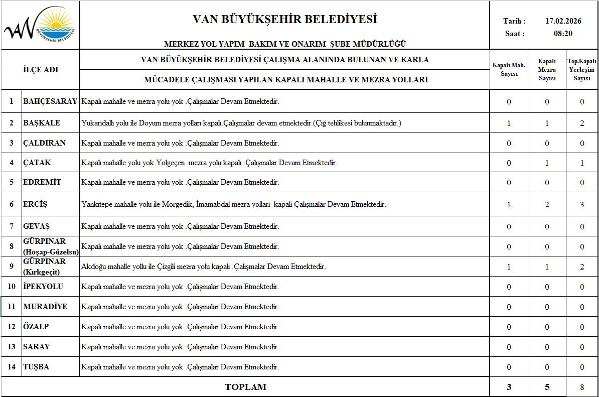 Belediyeden yapılan açıklamaya göre, 17 Şubat 2026 tarihi itibarıyla Van genelinde 3 mahalle yolu ve 5 mezra yolu olmak üzere toplam 8 yerleşim yerinin yolu ulaşıma kapandı.