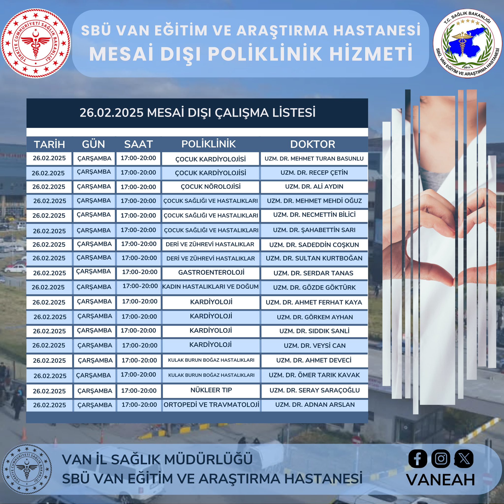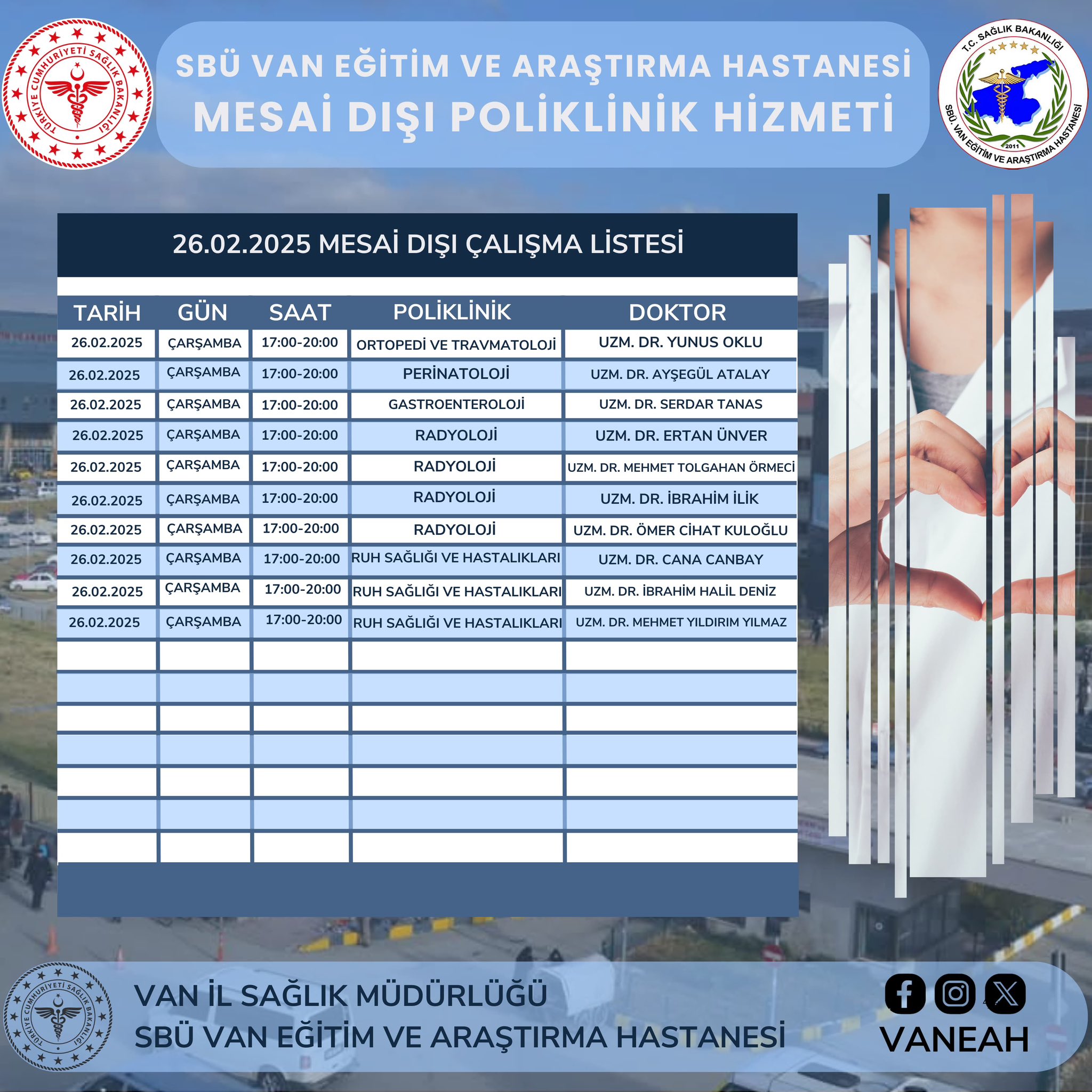 Son dönemlerde yapılan sağlık yatırımları ile Van ve bölge illere hizmet veren Sağlık Bilimleri Üniversitesi(SBÜ) Van Eğitim ve Araştırma Hastanesi, vatandaşların sağlık hizmetlerinden etkin bir şekilde faydalanabilmesi ve mevcut poliklinik hizmetlerinde yaşanan yoğunluğun azaltılması için belirli poliklinikler mesai sonrası da hizmet vermeye başladı. Randevular 182’i arayarak yada MHRS sistemi üzerinden alınabilecek.