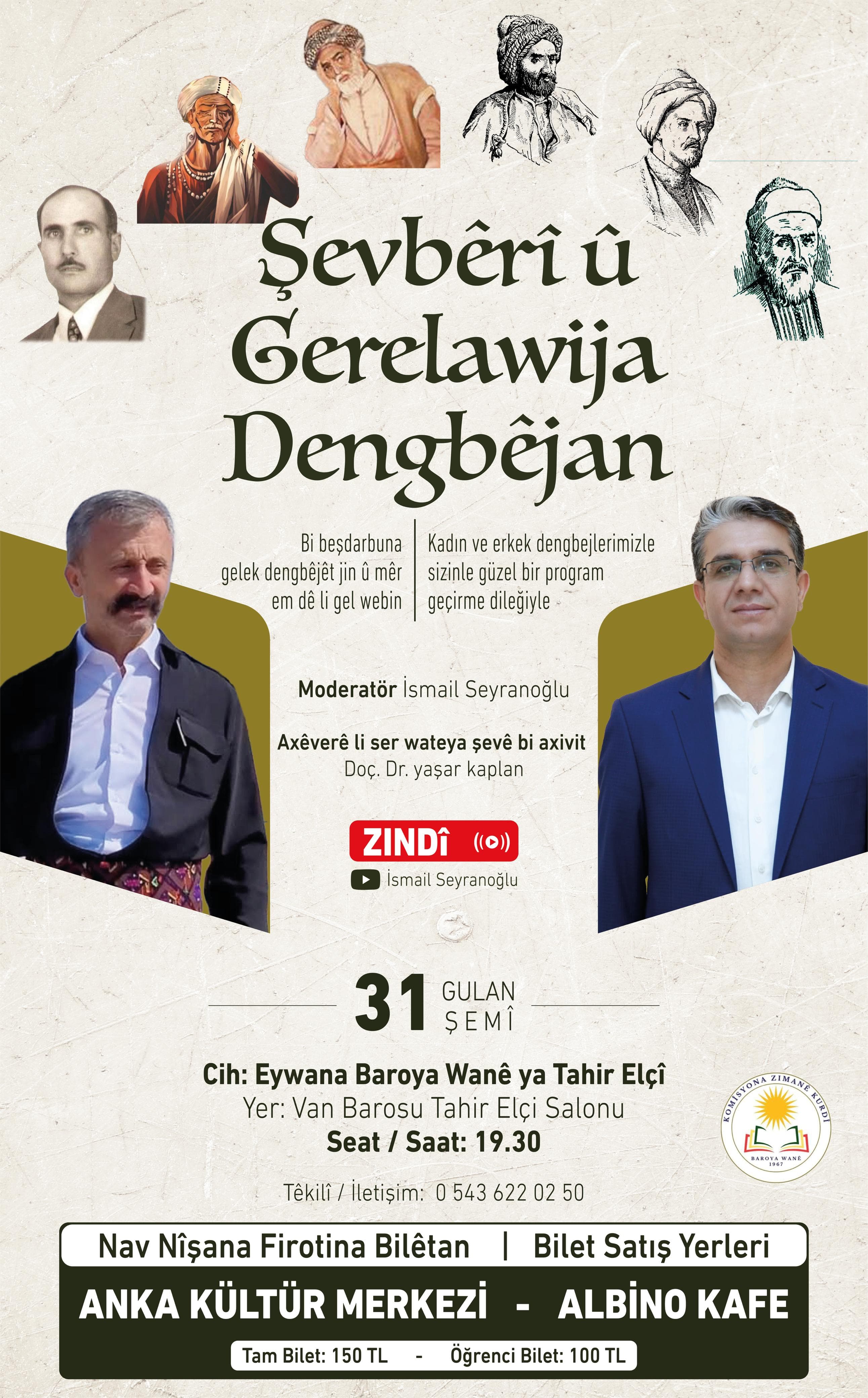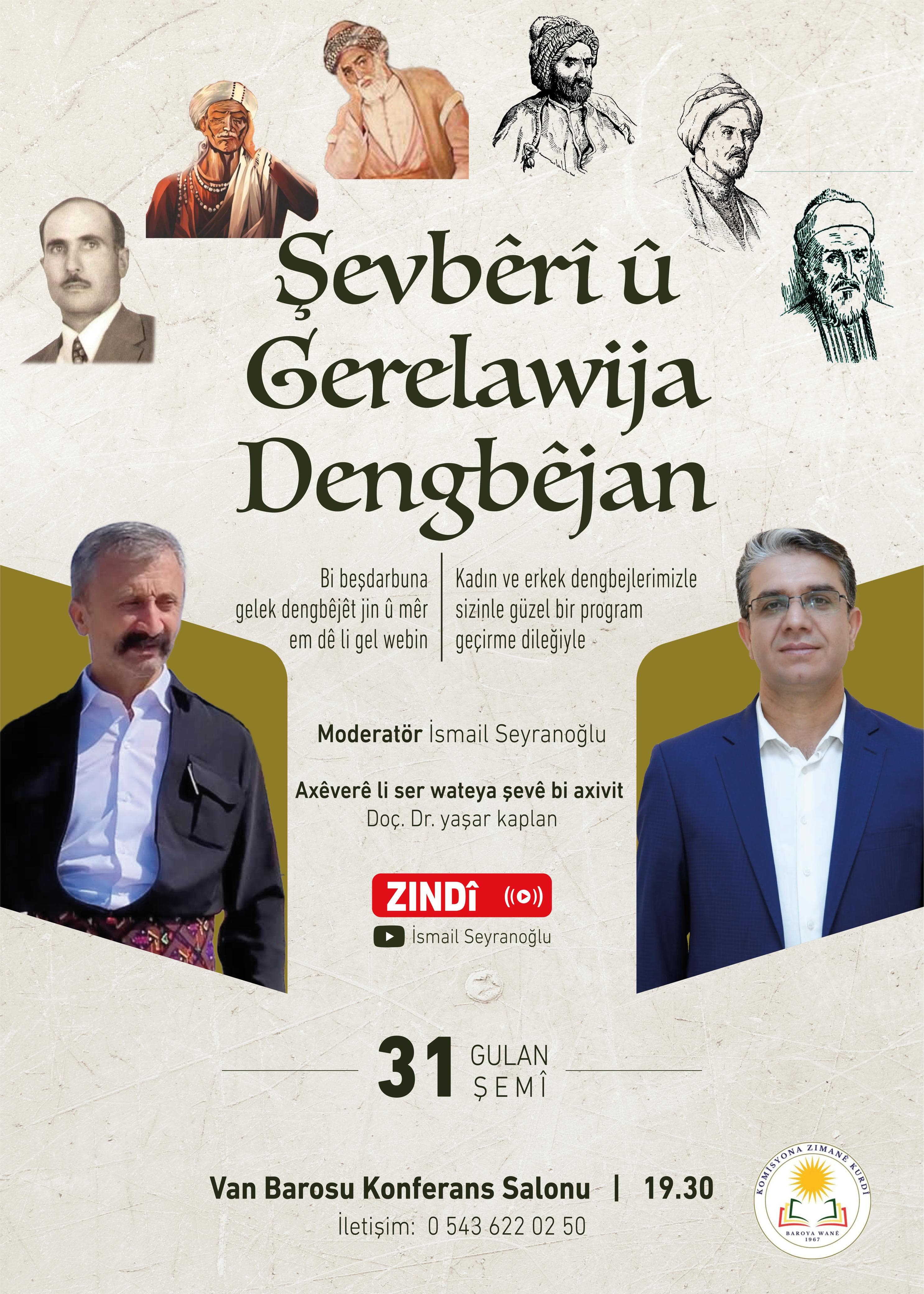 Van’da sık sık dengbêj programları düzenleyen Seyranoğlu, bu kez Van Barosu Konferans Salonu’nda sahne alacak. Gecede, programın önemi ve içeriğine dair değerlendirmelerde bulunmak üzere araştırmacı-yazar Doç. Dr. Yaşar Kaplan da katılımcılara hitap edecek. Pek çok dengbêj ile birlikte, akademisyen ve araştırmacıların da yer alacağı etkinlik, geniş bir kültürel buluşmaya sahne olacak. Van Barosu Kürt Dili Komisyonu’nun da destek sunduğu program, 31 Mayıs Cuma günü saat 19.30’da Van Barosu Tahir Elçi Konferans Salonu’nda gerçekleştirilecek. Etkinlik, eş zamanlı olarak sosyal medya platformları üzerinden de canlı yayınlanacak.