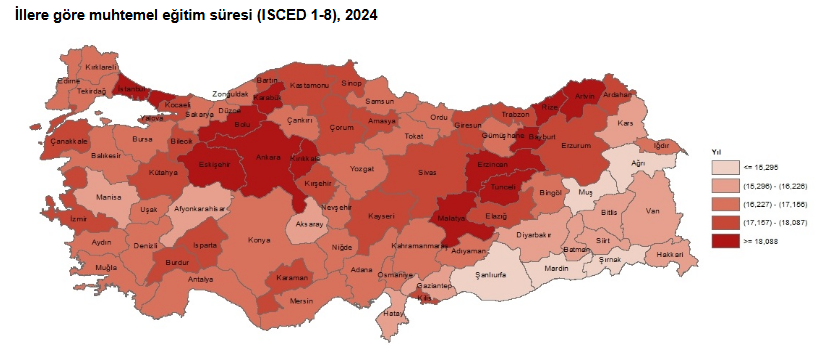 Van’da muhtemel eğitim süresi kadınlarda 15,7 yıl, erkeklerde ise 15,2 yıl olarak hesaplandı. Böylece kadınların eğitimde geçirdiği süre erkeklere kıyasla daha yüksek çıktı.