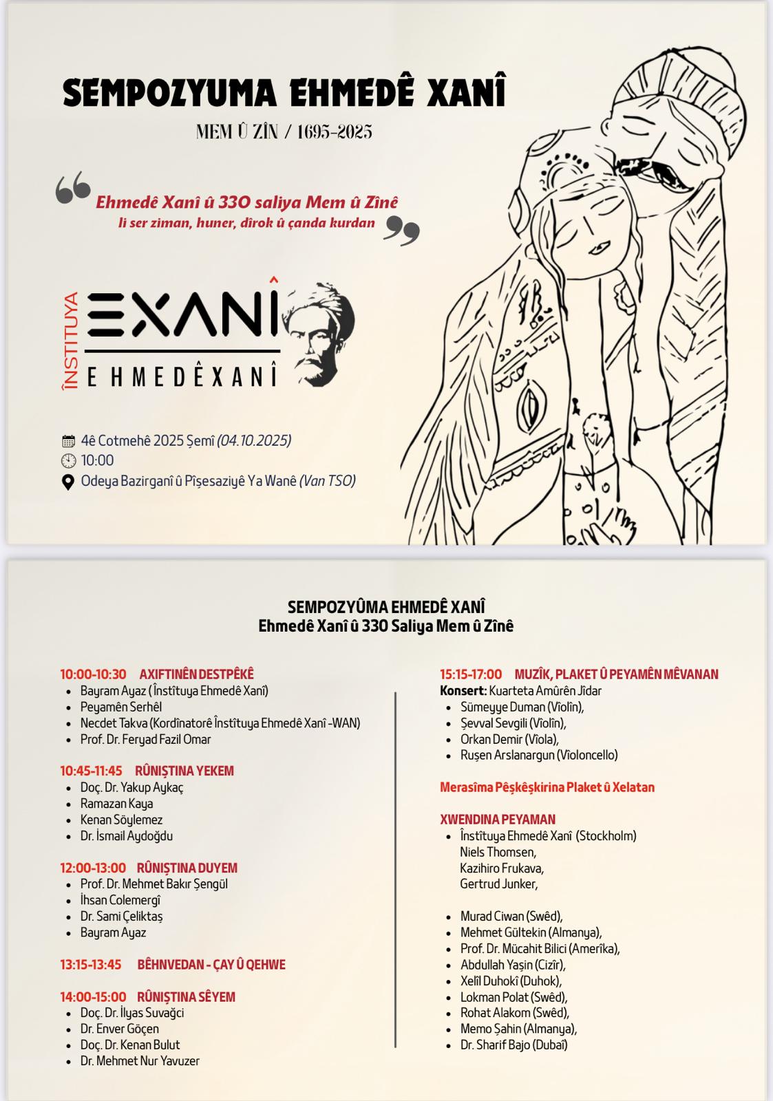 Van’da Ahmedê Xanî Sempozyumu 4 Ekim 2025 Cumartesi günü Van Ticaret ve Sanayi Odası'nda (Van TSO) gerçekleştirilecek. Sempozyumda 3 ayrı oturum düzenlenecek. Ayrıca Plaket ve Ödül Takdim Töreni yapılacak. Sempozyumda bir konser verilmesi de planlanıyor. Etkinlik, saat 10:00'da açılış konuşmaları ile başlayacak. Birçok araştırmacı sempozyuma tebliğlerini sunacak, yabancı araştırmacıların mesajları da okunacak.