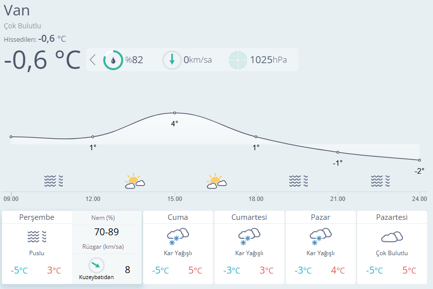 Parçalı yer yer çok bulutlu, sabah ilk saatlerde Van çevrelerinin hafif kar yağışlı geçeceği tahmin ediliyor. Sabah ve gece saatlerinde bölge genelinde buzlanma ve don ile birlikte pus ve yer yer sis bekleniyor. Doğusunun yüksek kar örtüsüne sahip eğimli kesimlerinde çığ ve kar erime tehlikesi bulunmaktadır.