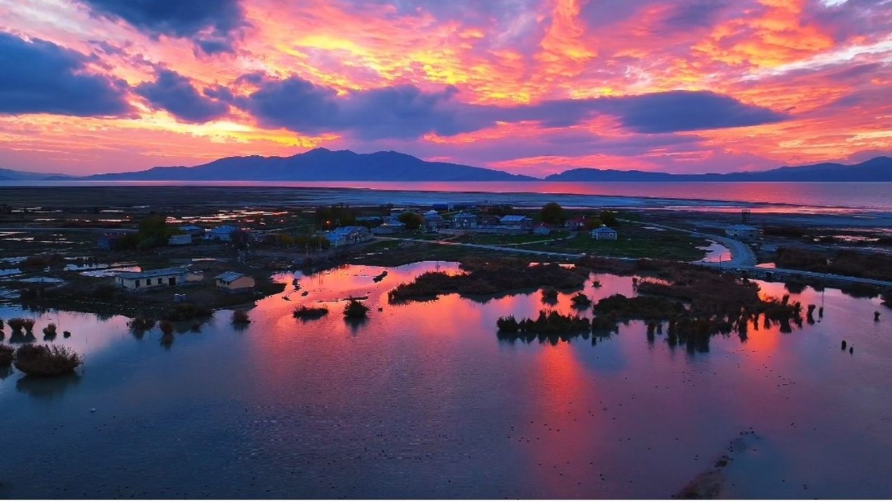 Van’ın doğusunda yer alan Erçek Gölü, gün batımında bir kez daha büyüleyici görüntülere sahne oldu. Doğa fotoğrafçısı Recep Dağ tarafından dronla kaydedilen görüntülerde, güneşin turuncu ve kızıl tonları gölün sakin sularına yansırken ortaya kartpostallık manzaralar çıktı. Günün son ışıklarıyla birlikte göl yüzeyinde oluşan renk cümbüşü, izleyenleri adeta mest etti. Gökyüzünün yavaş yavaş kararmaya başlamasıyla birlikte kuşların siluetleri de görüntülere ayrı bir güzellik kattı.