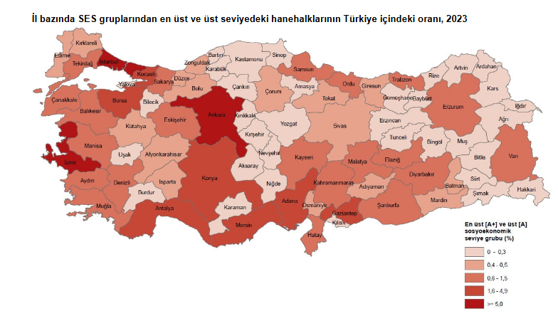 Verilere göre Türkiye genelinde hanehalklarının yalnızca yüzde 1,1’i en üst seviyede, yüzde 11’i üst seviyede, yüzde 16,4’ü üst altı seviyede, yüzde 19,7’si üst orta seviyede, yüzde 16,5’i alt orta seviyede, yüzde 18,6’sı alt seviyede ve yüzde 16,7’si ise en alt seviyede yer aldı.