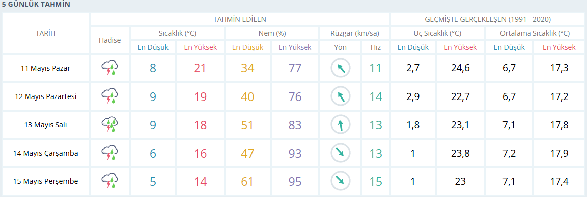 Meteoroloji Genel Müdürlüğü tarafından yapılan tahminlere göre: Ülkemiz genelinin parçalı ve çok bulutlu, Doğu Akdeniz’in Toroslar mevkii, İç Anadolu (Konya'nın güneyi ve Karaman hariç), Karadeniz, Doğu Anadolu, Güneydoğu Anadolu’nun doğusu ile Bilecik, Sakarya, Bursa'nın doğusu, Kütahya, Uşak, Afyonkarahisar, Adana ve Isparta çevrelerinin yerel olmak üzere aralıklı sağanak ve gök gürültülü sağanak yağışlı geçeceği tahmin ediliyor. Yağışların, Orta ve Doğu Karadeniz ile Erzurum'un kuzeyi, Kars ve Ardahan çevrelerinde yer yer kuvvetli olması bekleniyor. Güneydoğu Anadolu’da toz taşınımı görüleceği tahmin ediliyor.